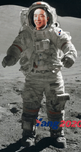 Content Description: a man in a space suit is standing on the moon with the year 2020 on the bottom