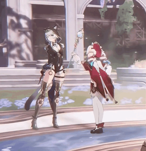 Content Description: two anime characters standing next to each other with one holding a staff