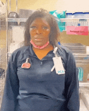 Content Description: a woman wearing a blue pca shirt stands in front of a pink sign that says personal care