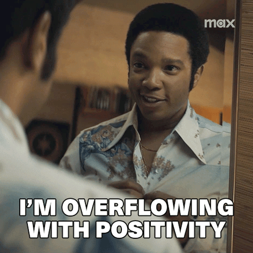 Content Description: a man is looking at himself in the mirror and says i 'm overflowing with positivity