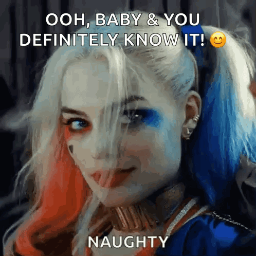 - Content Description: a picture of harley quinn with a caption that says ooh baby & you definitely know it