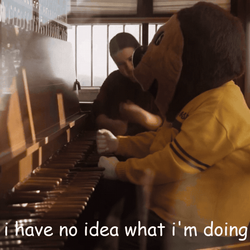 Content Description: a mascot playing a piano with the words i have no idea what i 'm doing below him