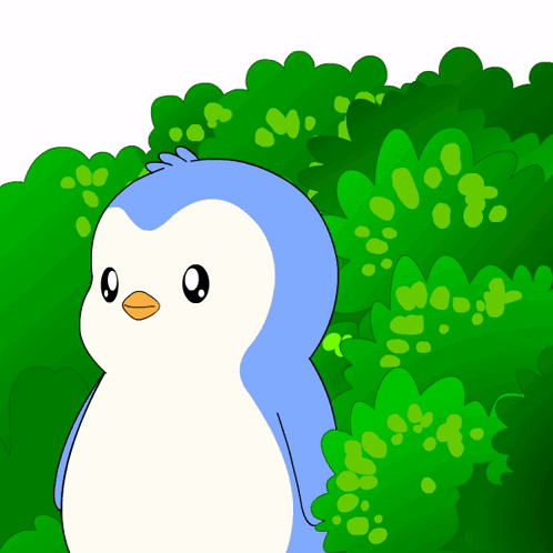Content Description: a blue and white penguin with an orange beak is standing in front of a green bush