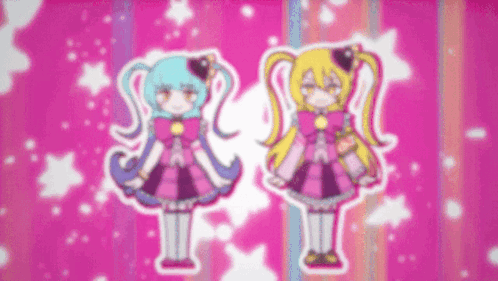 - Content Description: two anime girls are standing next to each other on a pink background with stars .