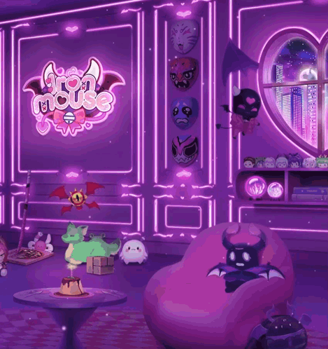 Content Description: a room with purple walls and a neon sign that says " i love mouse "