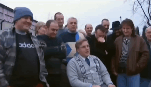 Content Description: a group of men are standing around a man in a wheelchair who is wearing an adidas shirt