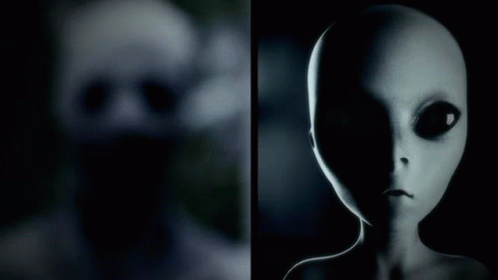 Content Description: a close up of a person 's face and a close up of an alien 's face in a dark room .