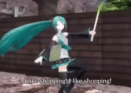Content Description: a cartoon character is holding a green flag and saying `` i like shopping , i like shopping ! ''