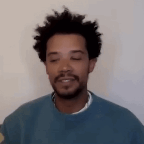 Content Description: a man with a beard and curly hair is wearing a blue sweater and smiling with his eyes closed .