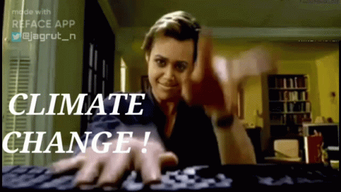 Content Description: a woman is typing on a keyboard with the words " climate change " on the bottom