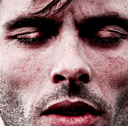 Content Description: a close up of a man 's face with his eyes closed and red lips