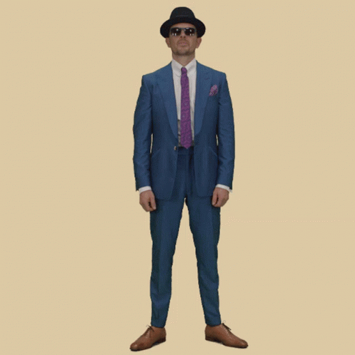 Content Description: a man in a blue suit and purple tie is wearing a hat