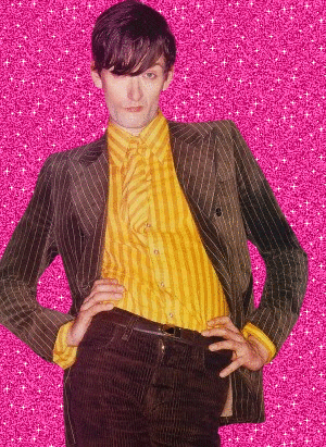 Content Description: a man with his hands on his hips is wearing a yellow striped shirt and a green suit