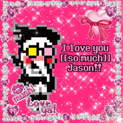 Content Description: a pixel art greeting card that says " i love you also much jason "