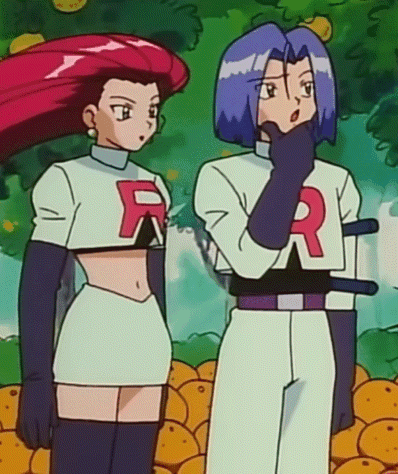 Content Description: two cartoon characters , jessie and james , are standing next to each other in a field of oranges .