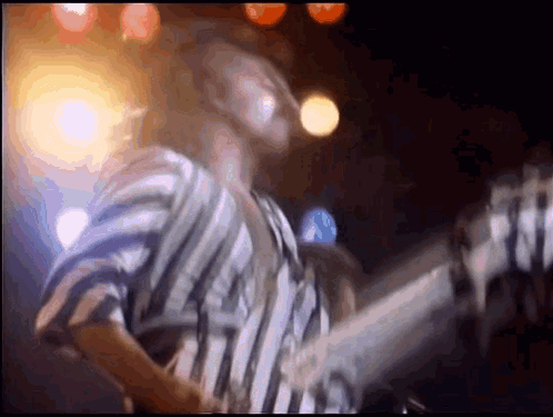 Content Description: a man in a striped shirt is playing a bass guitar on stage .