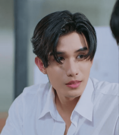 Content Description: a close up of a young man wearing a white shirt and earrings .
