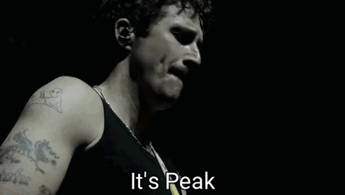 Content Description: a man with a mustache is singing on a stage and the words `` it 's peak '' are visible .