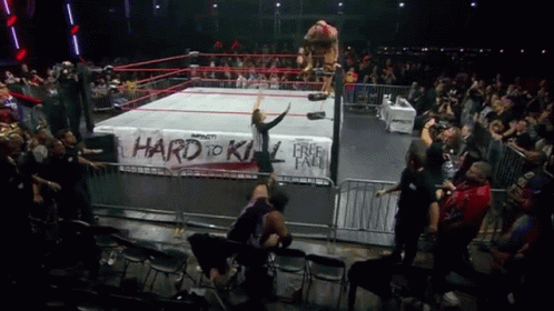 Content Description: a wrestling ring with a sign that says hard to kill free fall