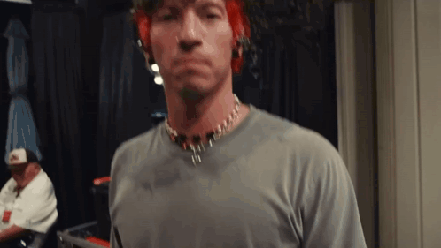 Content Description: a man with red hair is wearing a gray shirt and a necklace .