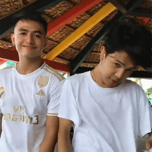 Content Description: two young men in white shirts are standing next to each other and smiling .