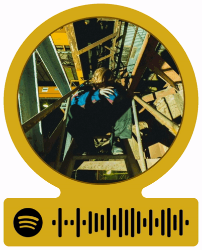 Content Description: a picture of a person sitting on a ladder with a spotify code below it