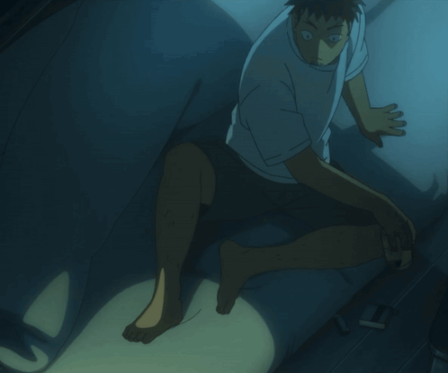Content Description: a man in a white shirt sits with his legs crossed and holds a can of beer