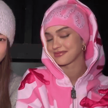 Content Description: a woman is wearing a pink hoodie and a pink hat .