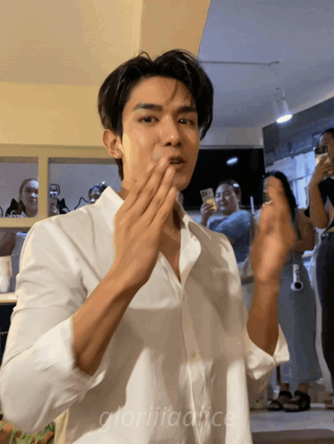 Content Description: a man in a white shirt is standing in front of a sign that says glorijiaalice