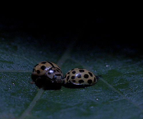 Content Description: two ladybugs are on a green leaf in the dark