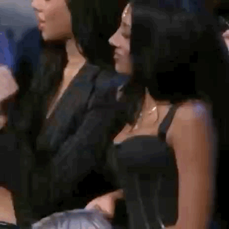 Content Description: two women are sitting next to each other in a crowd . one of the women is wearing a black top .