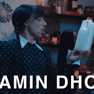 Content Description: a man in a black dress is holding a bottle of milk with the words amin dhc written below him