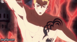 Content Description: a man with a tattoo on his arm is standing in a fire .