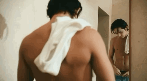 Content Description: a shirtless man is standing in front of a mirror with a towel wrapped around his neck .