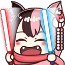 Content Description: a cartoon cat is holding two lightsabers in front of its face .