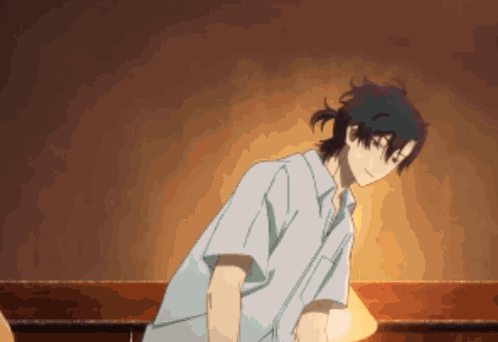 Content Description: a man in a blue shirt is standing in front of a lamp