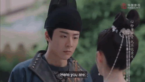 Content Description: a man and a woman are looking at each other and the man is saying " here you are "