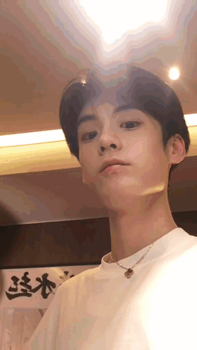 Content Description: a young man taking a selfie in front of a sign that says ' chinese ' on it
