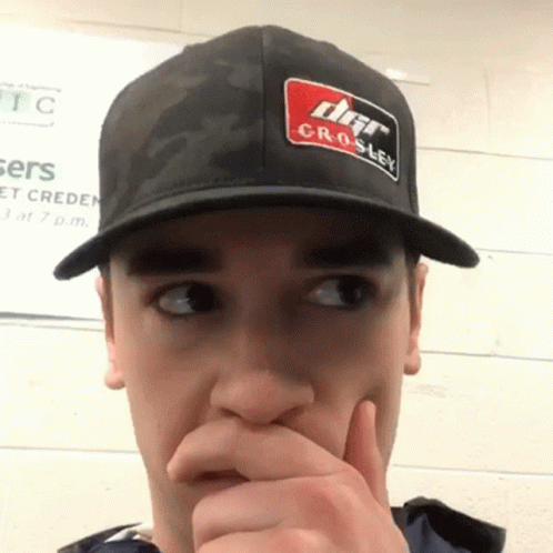 Content Description: a man wearing a hat with the word crosley on it covering his mouth