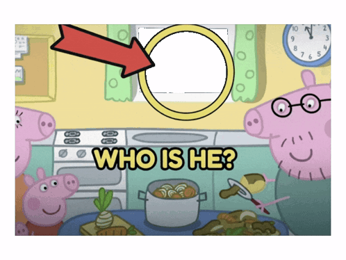 Content Description: a peppa pig cartoon asking who is he in the kitchen