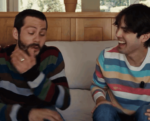 Content Description: two men wearing striped sweaters are sitting on a couch laughing