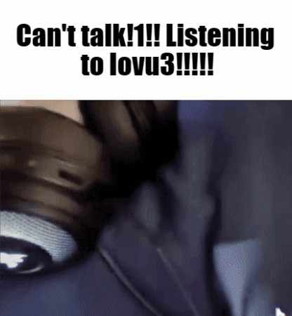 Content Description: a person wearing headphones with the words can 't talk listening to lovu3