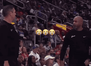 Content Description: a man is standing in front of a crowd of people at a basketball game and applauding .