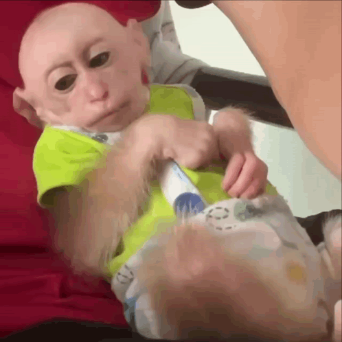 Content Description: a baby monkey wearing a green shirt is playing with a bottle