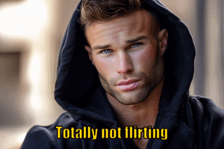 Content Description: a man in a black hoodie with the words " totally not flirting " on the bottom