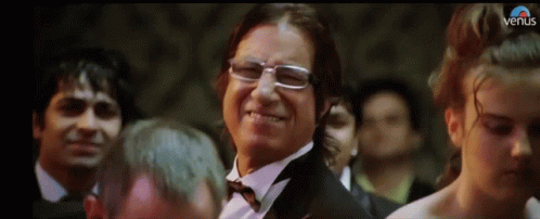Content Description: a man in a tuxedo and bow tie is smiling in front of a crowd of people .