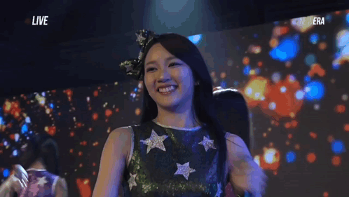 Content Description: a woman holding a microphone in front of a screen that says live on it