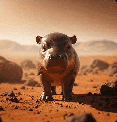 Content Description: a baby hippopotamus standing in the dirt and rocks
