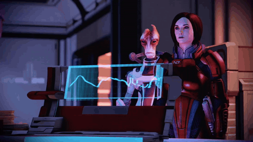Content Description: a woman in a n7 uniform is standing next to a cartoon character