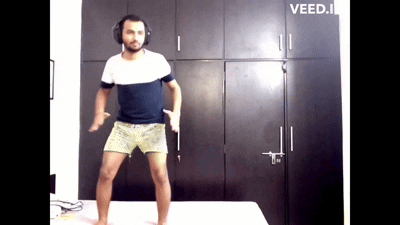 Content Description: a man wearing headphones is dancing on a bed with the word veed.i on the bottom